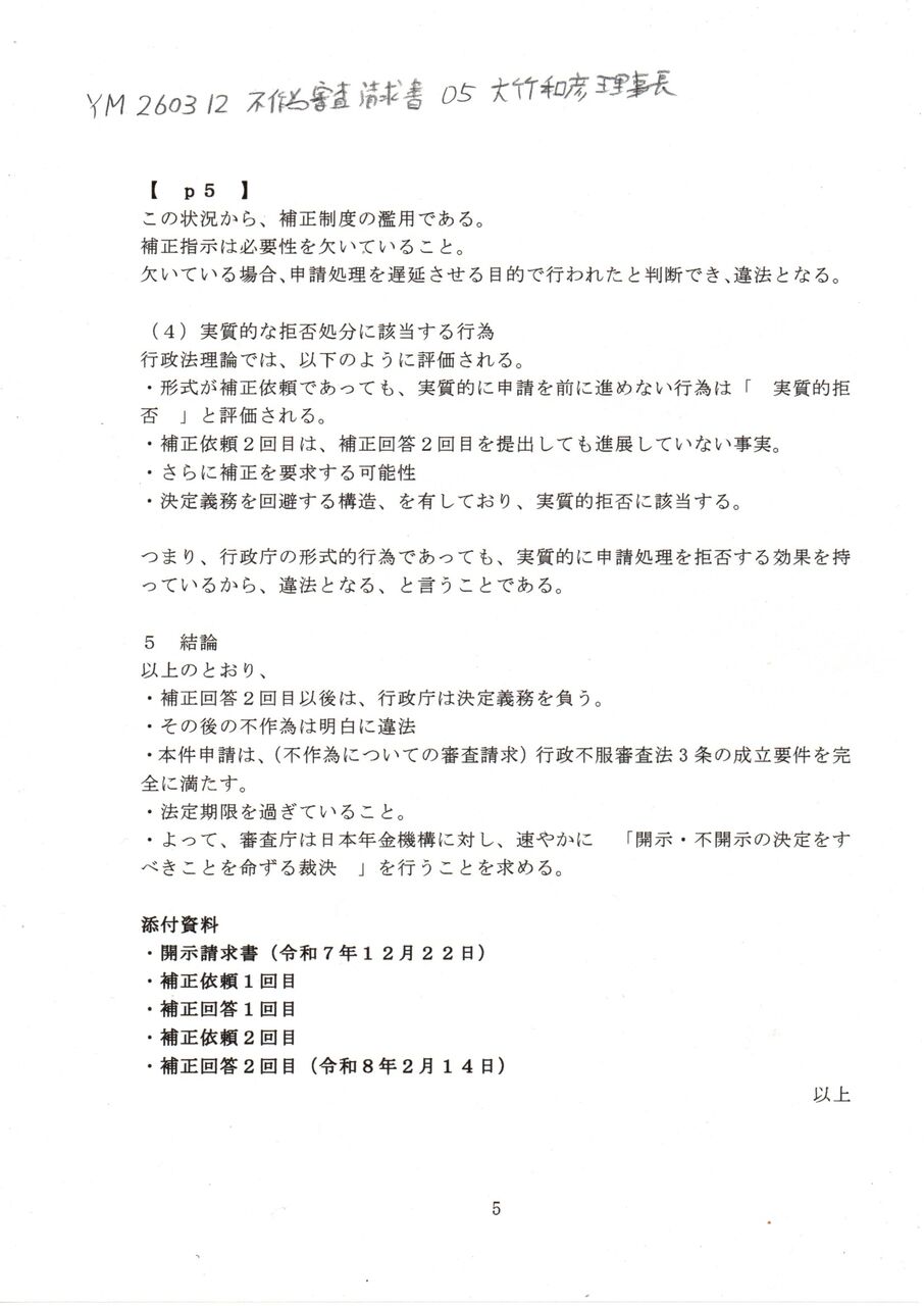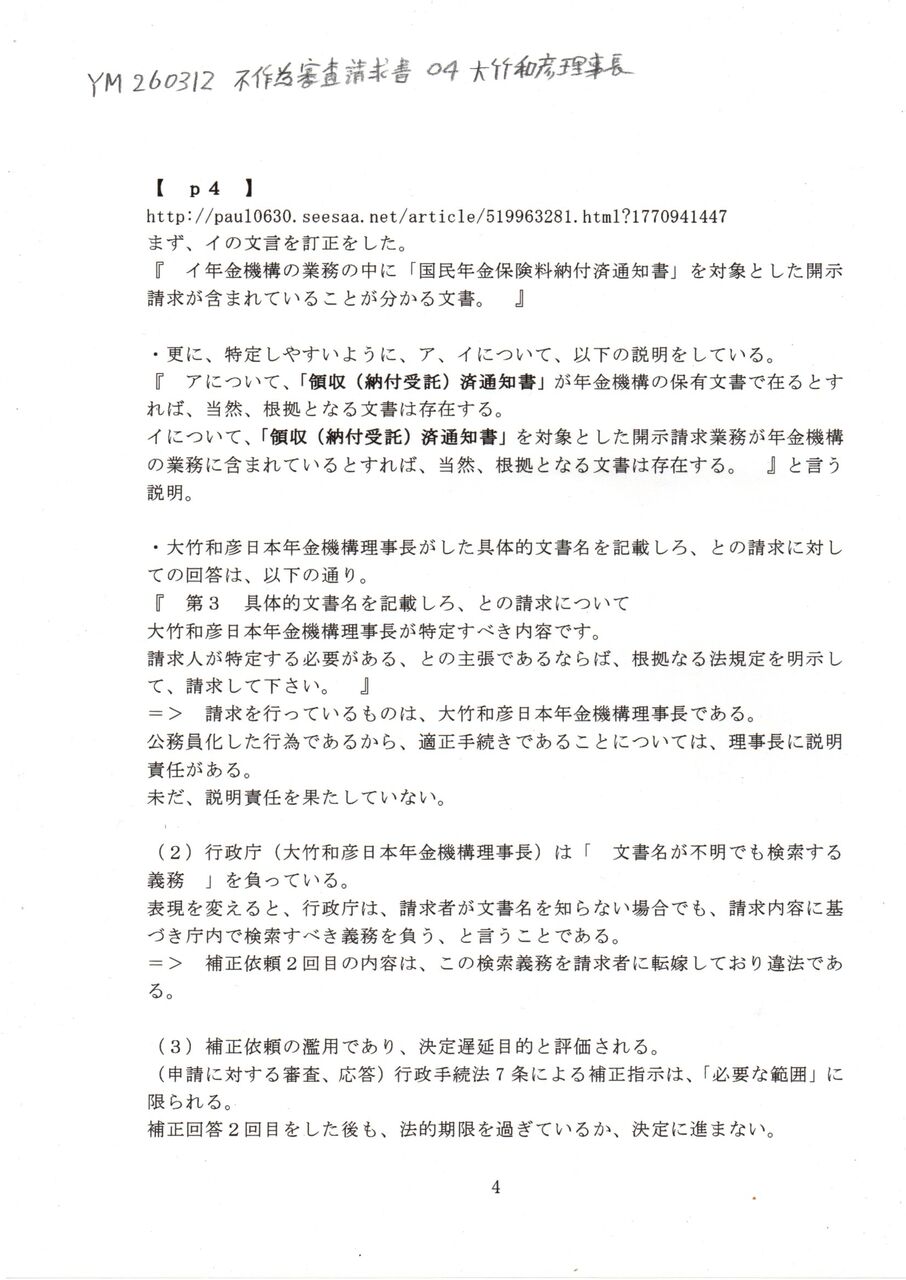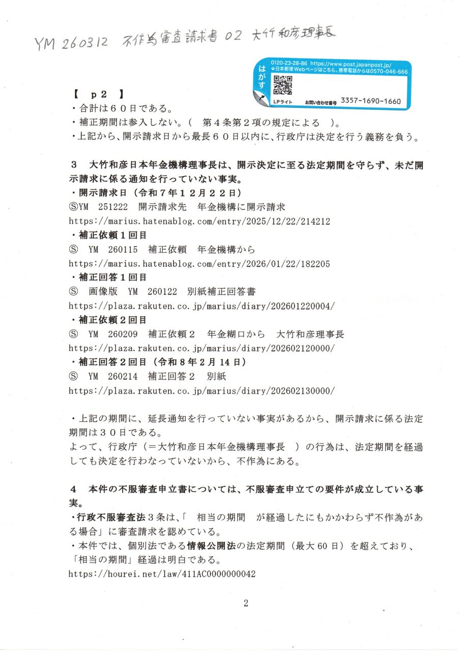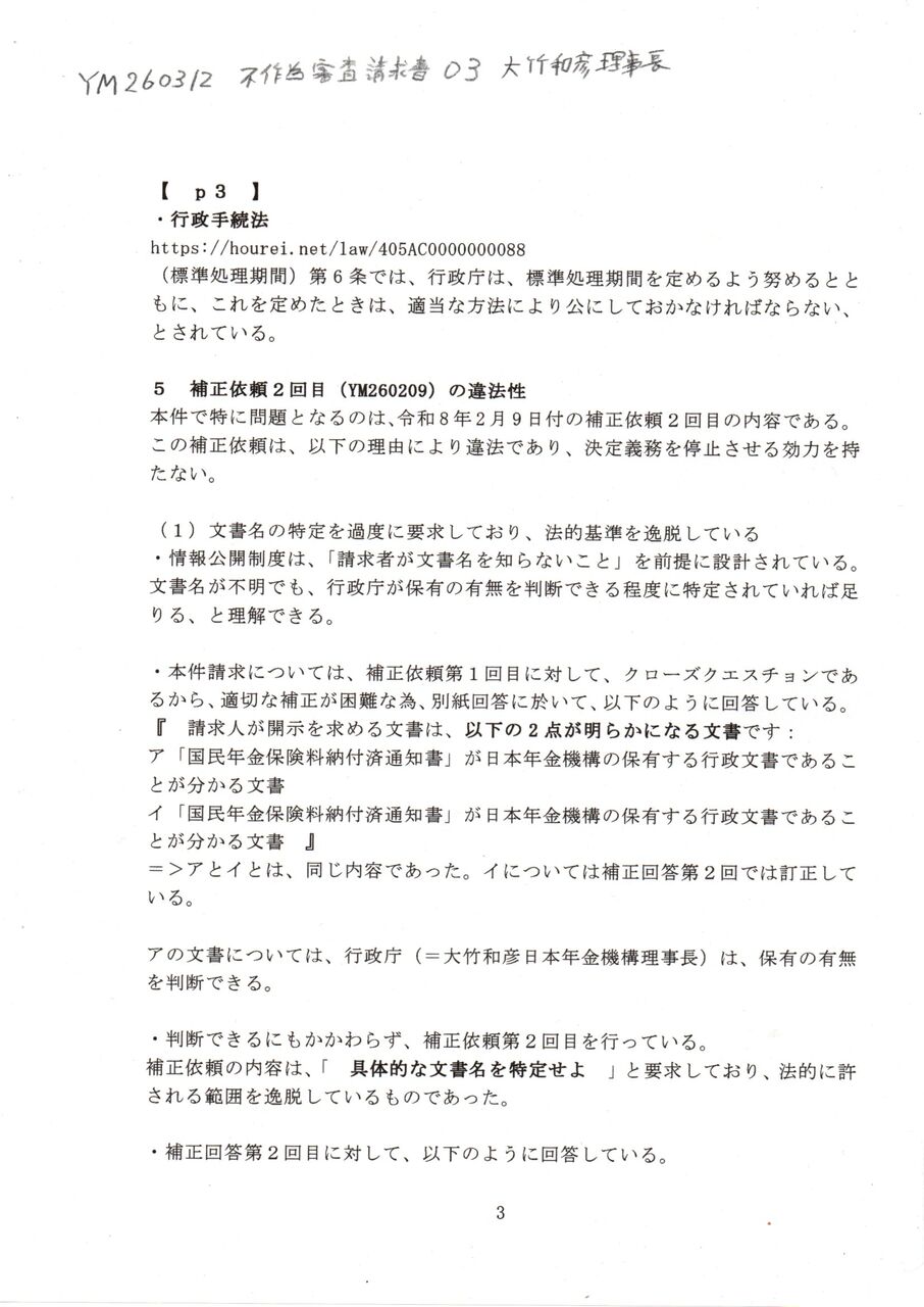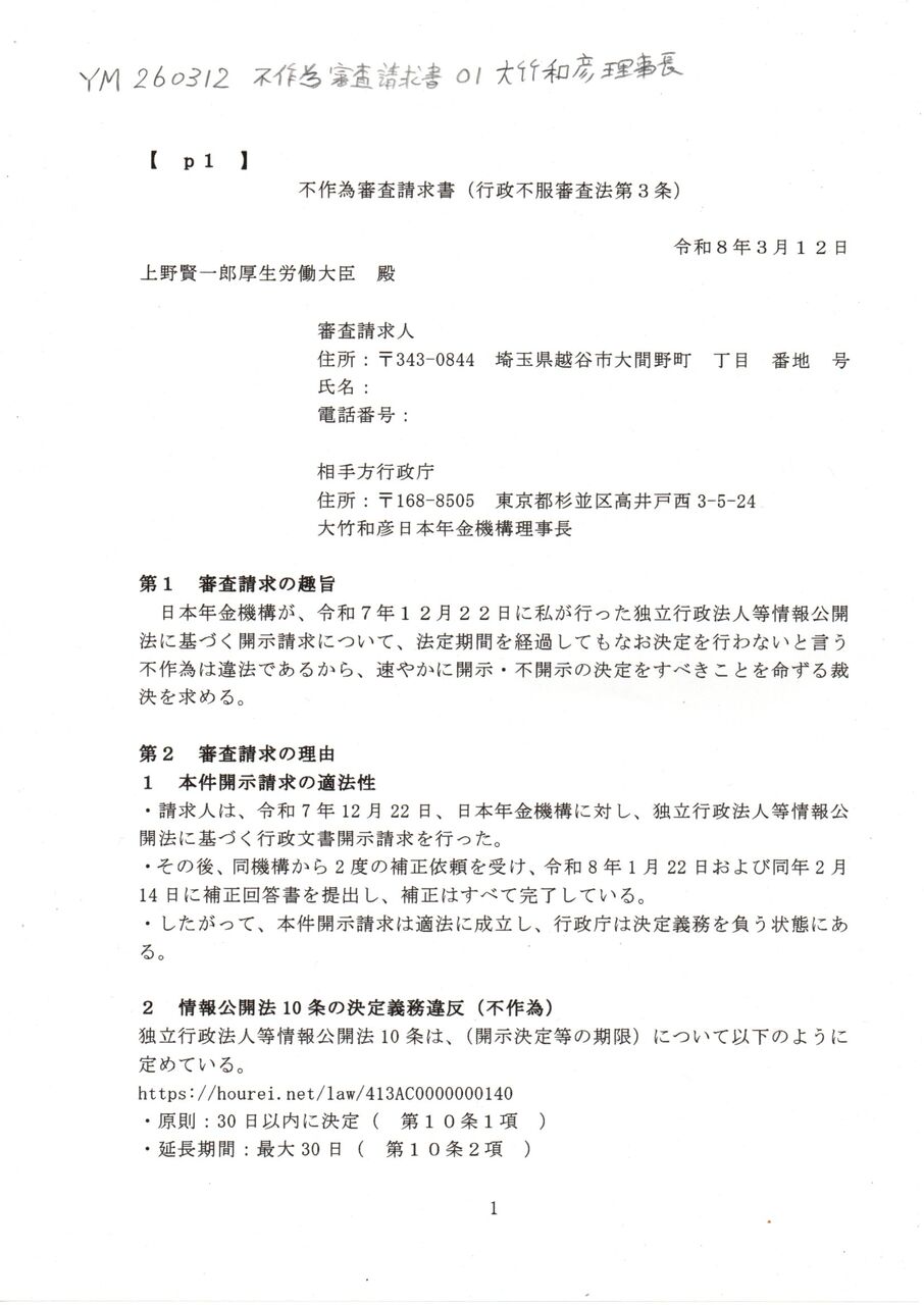 Ⓢ YM 260312 不服審査申立て書 大竹和彦日本年金機構理事長 厚生労働省