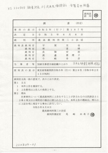 画像版 KS 230808 調書決定 久木元伸訴訟 宇賀克也判事 令和5年(行ツ)第187号 宇賀克也判事 林道晴裁判事 長峰安政判事 渡邉恵理子判事 今崎幸彦判事 原審 東京高裁令和5年(行コ)第28号作為給付請求控訴事件 吉田徹裁判官 橋本英史裁判官 石田憲一…