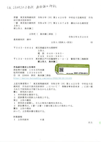 画像版 SK 230920 上告状 島田謙二訴訟 告訴状を受理しろ ○ 経緯 藤永かおる裁判官 => 中村也寸志裁判官 => 最高裁 Ⓢ SK 230227藤永かおる判決書 島田謙二訴訟 告訴状を受理しろ https://marius.hatenablog.com/entry/2023/03/11/094435 Ⓢ SK 230307 控…