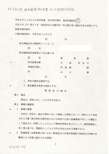 画像版 KY 231129 坂本康博判決書 小池百合子訴訟 東京地裁令和5年(ワ)第97号 虚偽有印公文書作成・同文書行使の違法行為を原因とする慰謝料請求事件 坂本康博裁判官 高木俊明裁判官 織田みのり裁判官 ( 關隆太郎裁判官 ) Ⓢ KY 231130謄写 弁論調書6…