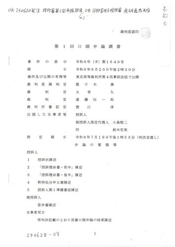 画像版 OK 240620 控訴審第1回弁論調書 岡部喜代子訴訟 鹿子木康裁判官 角井俊文裁判官 進藤壮一郎裁判官 東京高等裁判所 令和6年(ネ)第1640号 「 訴訟手続きの違憲を原因とした契約違反 」を理由とする不当利得返還請求控訴事件 一審 東京地方裁判…