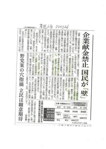 250326 産経6面 国民が「 壁 」 企業献金禁止 維新が政治団体を含めた全面禁止を検討したが、憲法の「 政治活動の自由 」に抵触することから断念した。 => 「 抵触するか、否か 」については、国会議員なのだから、国会の審議で、内閣法制局に答えさせろ…