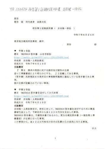 画像版 YR 250624 証拠説明書 吉田隆一訴訟 予納切手流用 事件名 吉田隆一上席訟務官が職務懈怠をしたことを請求権発生原因事実として発生した損出金を理由とする損害賠償請求事件 https://imgur.com/a/kRtuz7s http://blog.livedoor.jp/marius52/archives/5…