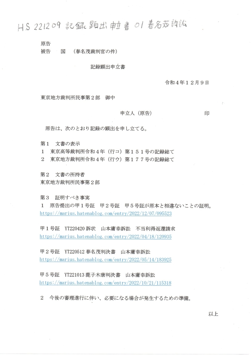 画像版 HS 221209 記録顕出申立書 春名茂訴訟 費用法第九条1項