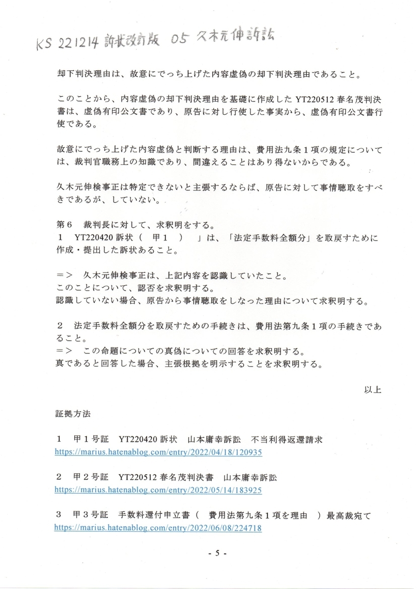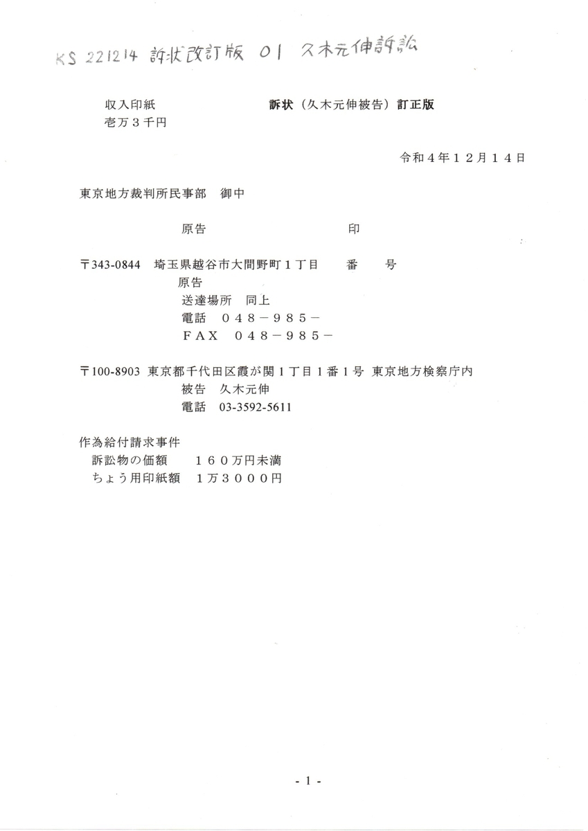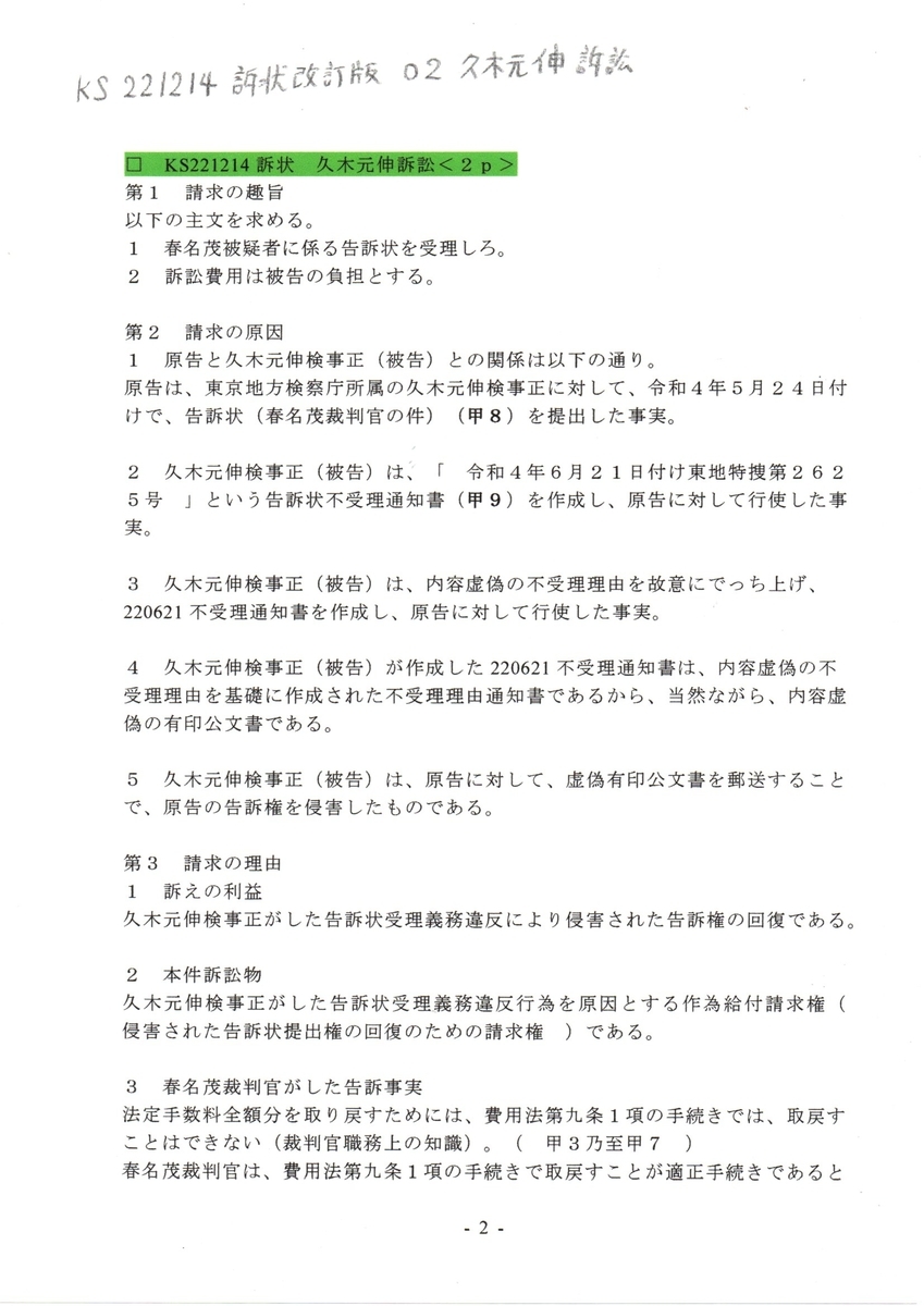 画像版 KS 221214 訴状改定版 久木元伸訴訟 春名茂裁判官に対する告訴状を受理しろ 作為給付請求事件 #久木元伸検事正 #春名茂裁判官 #春名茂法務省訟務局長