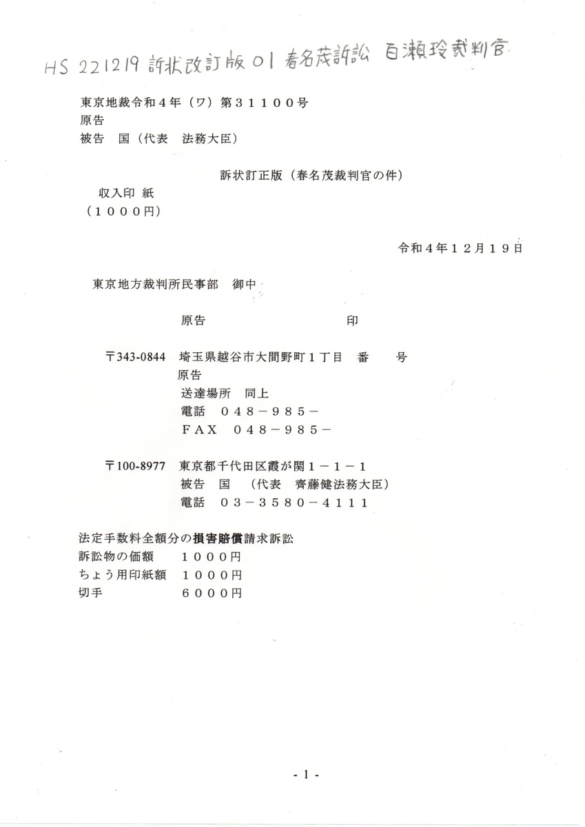 HS 221219 訴状訂正版 01春名茂訴訟 百瀬玲裁判官