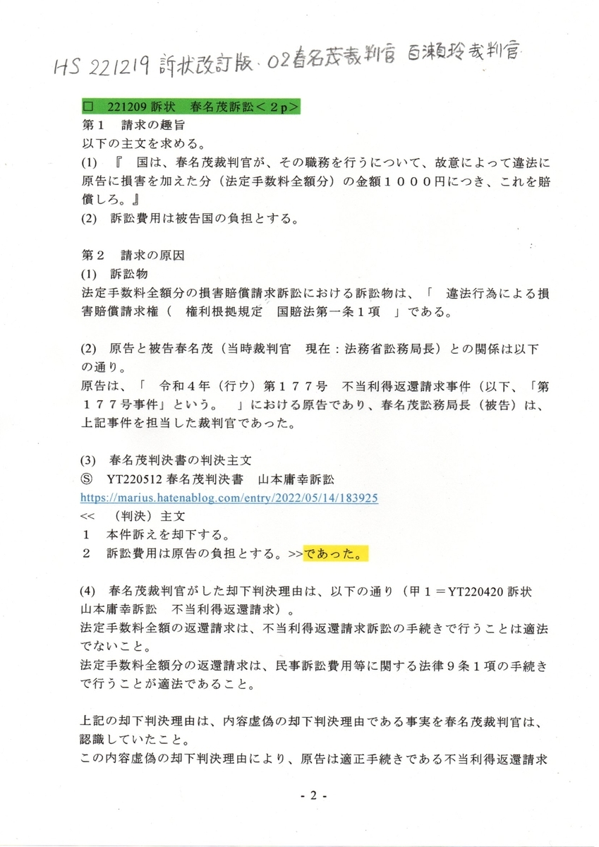 HS 221219 訴状訂正版 02春名茂訴訟 百瀬玲裁判官