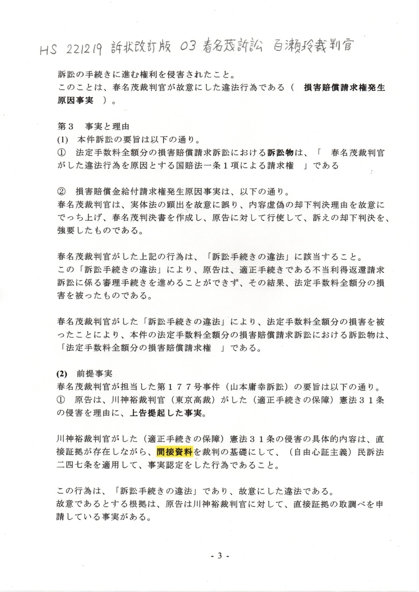 HS 221219 訴状訂正版 03春名茂訴訟 百瀬玲裁判官