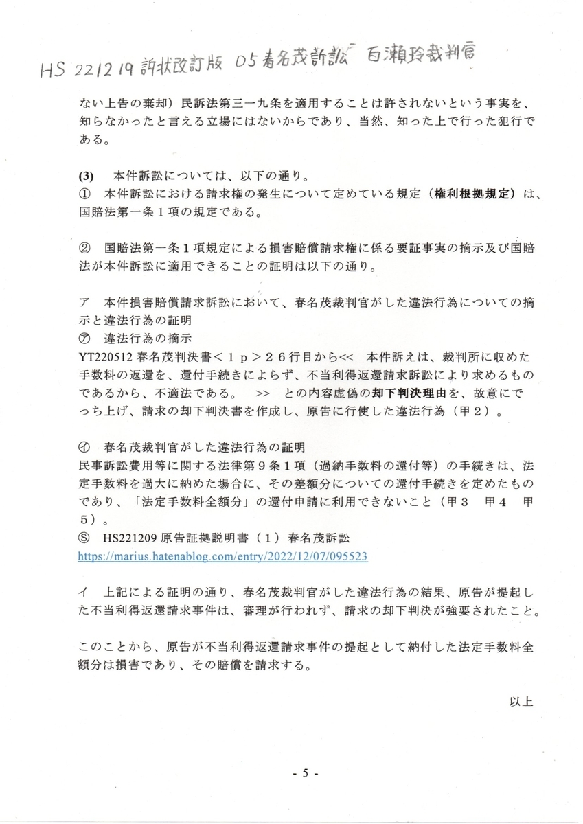 HS 221219 訴状訂正版 05春名茂訴訟 百瀬玲裁判官