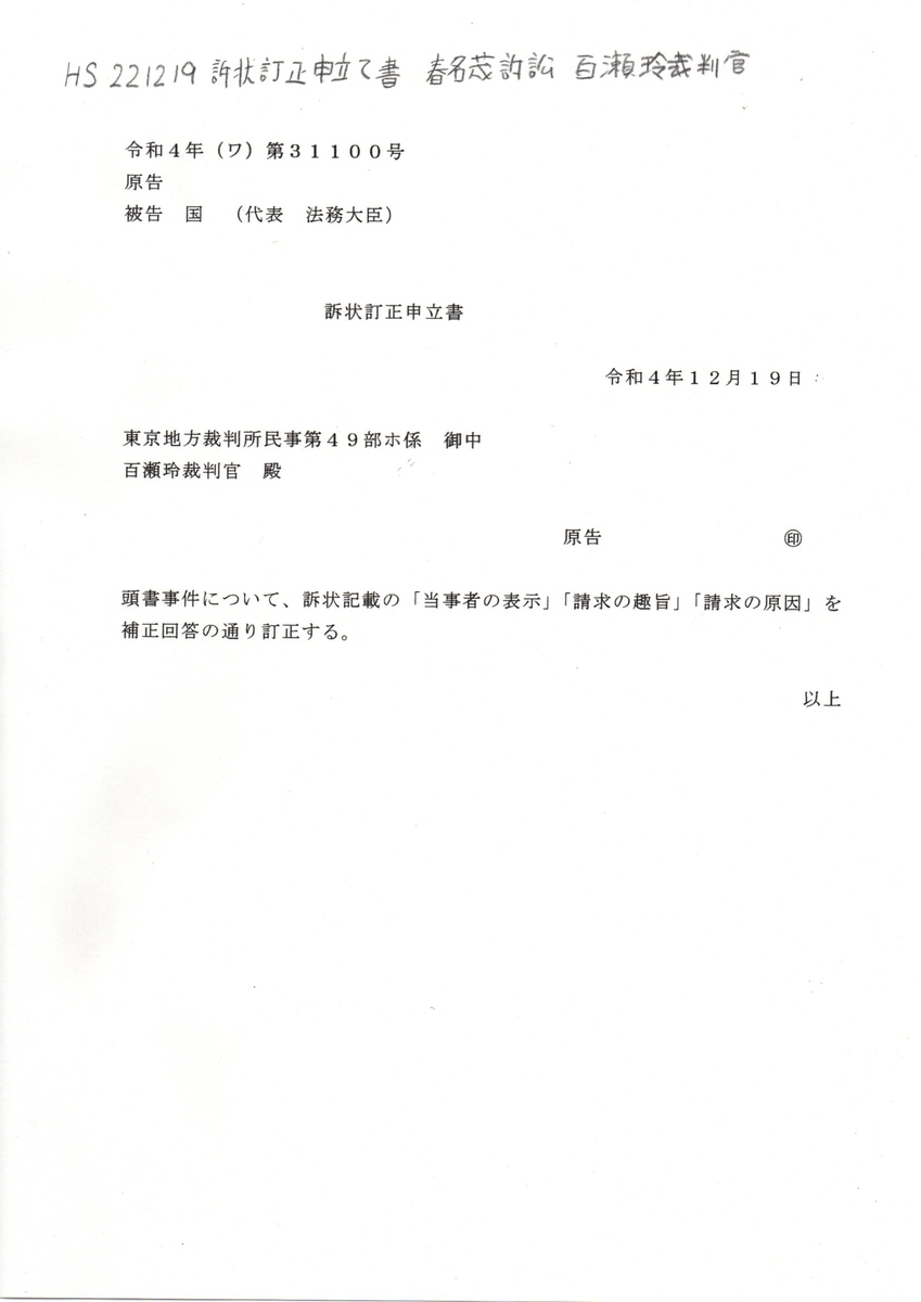 HS 221219 訴状訂正版 07訴状訂正申立書 春名茂訴訟 百瀬玲裁判官