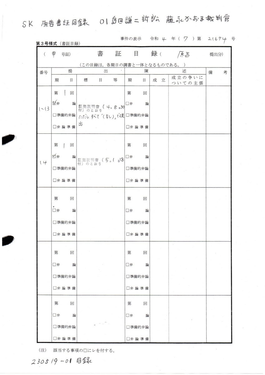 1 SK 原告書証目録 島田謙二訴訟 藤永かおる裁判官