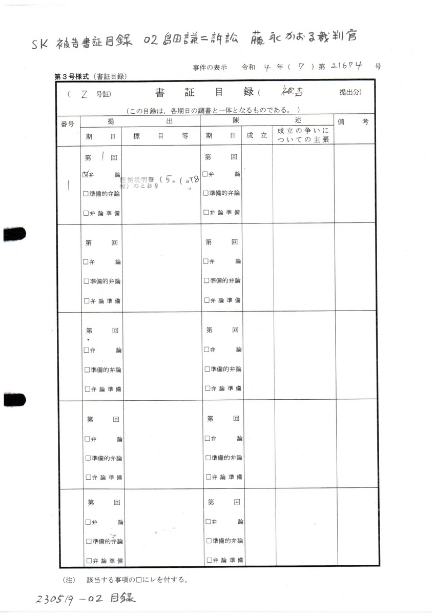2 SK 被告書証目録 島田謙二訴訟 藤永かおる裁判官