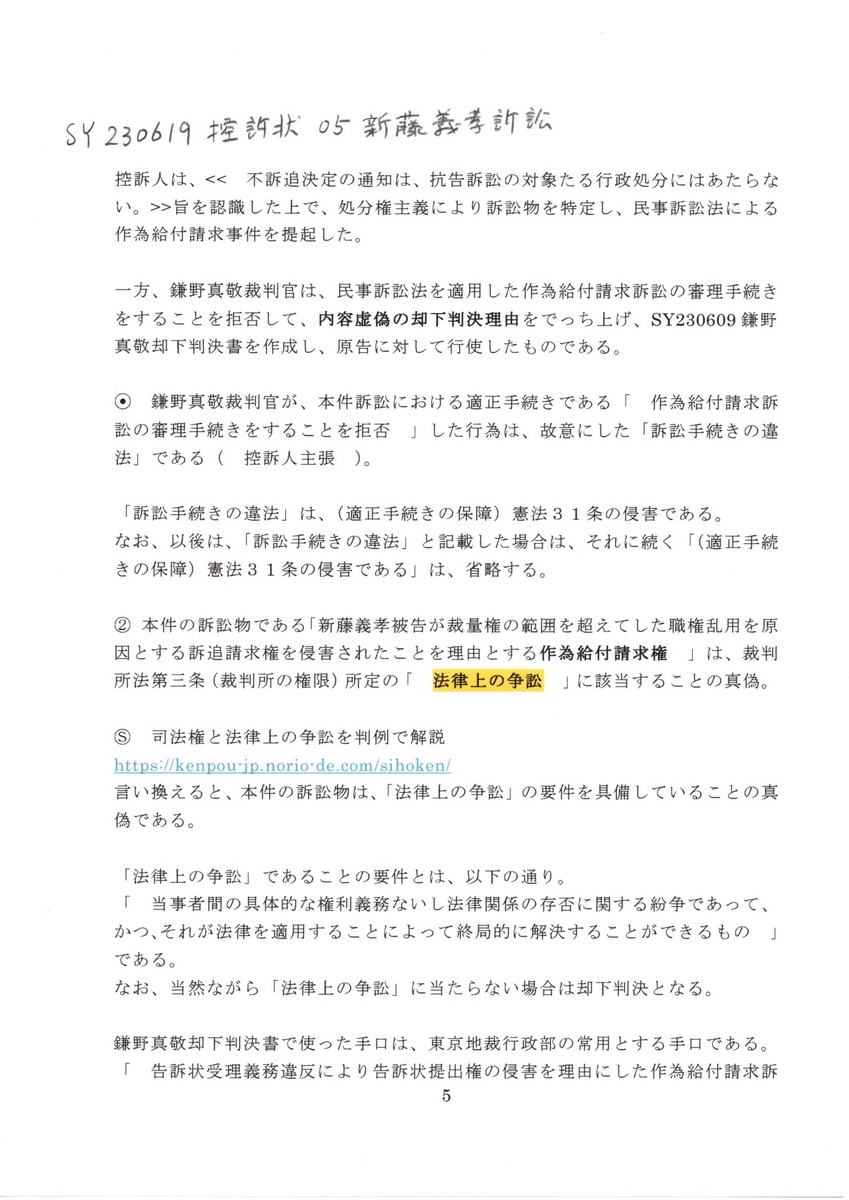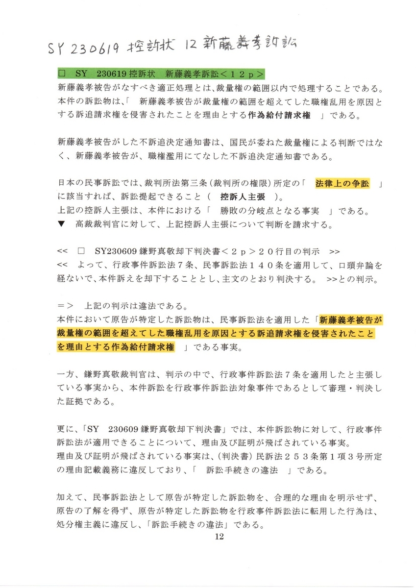 Ⓢ テキスト版 頁挿入 SY 230619 控訴状 新藤義孝訴訟 作為給付請求控訴事