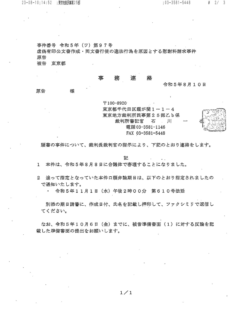 2 KY 230810_1452FAX受信 事務連絡 小池百合子訴訟