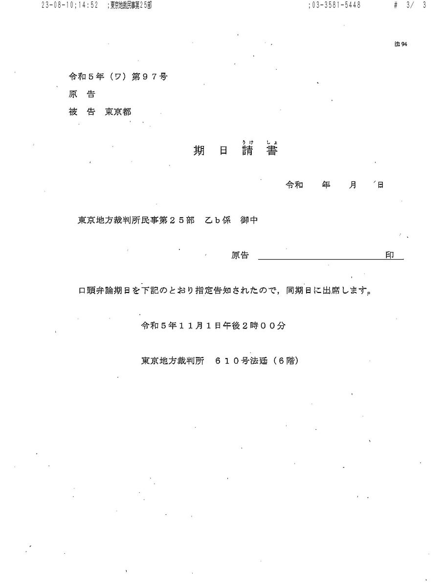 3 KY 230810_1452FAX受信 期日請書 小池百合子訴訟