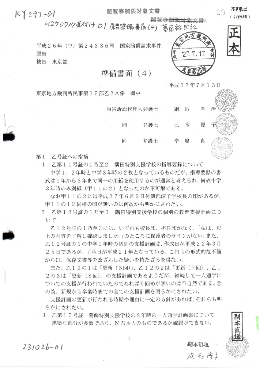1 KY 29丁 H270717受付け 01原告準備書面(4) 葛岡裕訴訟