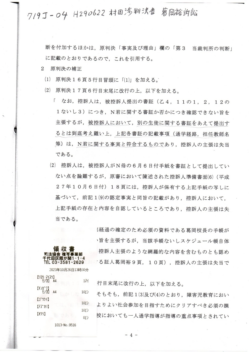 領収書 KY 719丁 H290622村田渉判決書・乙11関連抜粋 葛岡裕訴訟 村田渉裁判官