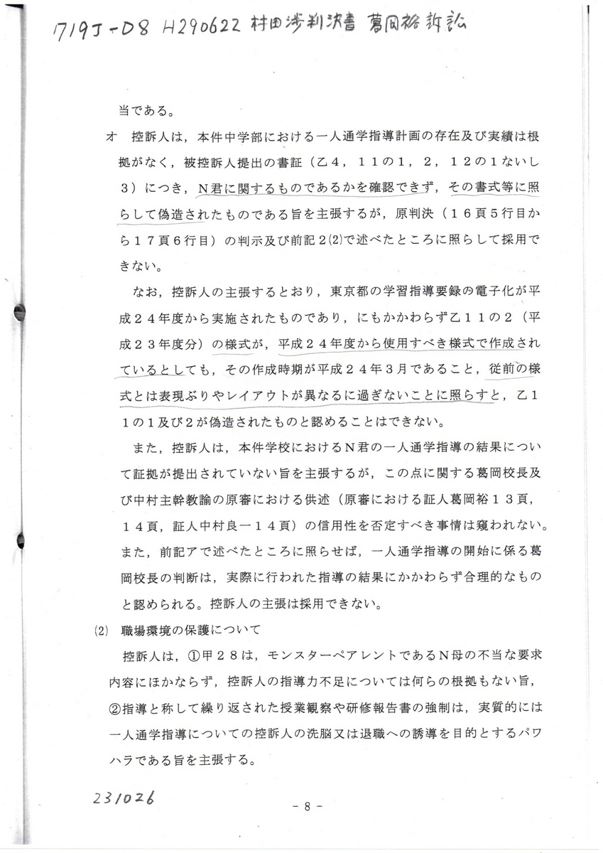<< オ 控訴人は,本件中学部における一人通学指導計画の存在及び実績は根拠がなく,被控訴人提出の書証( 乙4,11の1,2,12の1ないし3 )につき,N君に関するものであるかを確認できず,その書式等に照らして偽造されたものである旨を主張するが,原判決( 16頁5行目から17頁6行目 )の判示及び前記2(2)で述べたところに照らして採用できない。