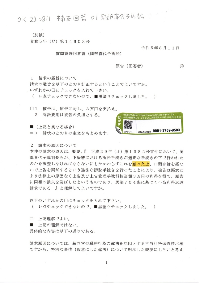 Ⓢ OK 230811 補正回答 岡部喜代子訴訟