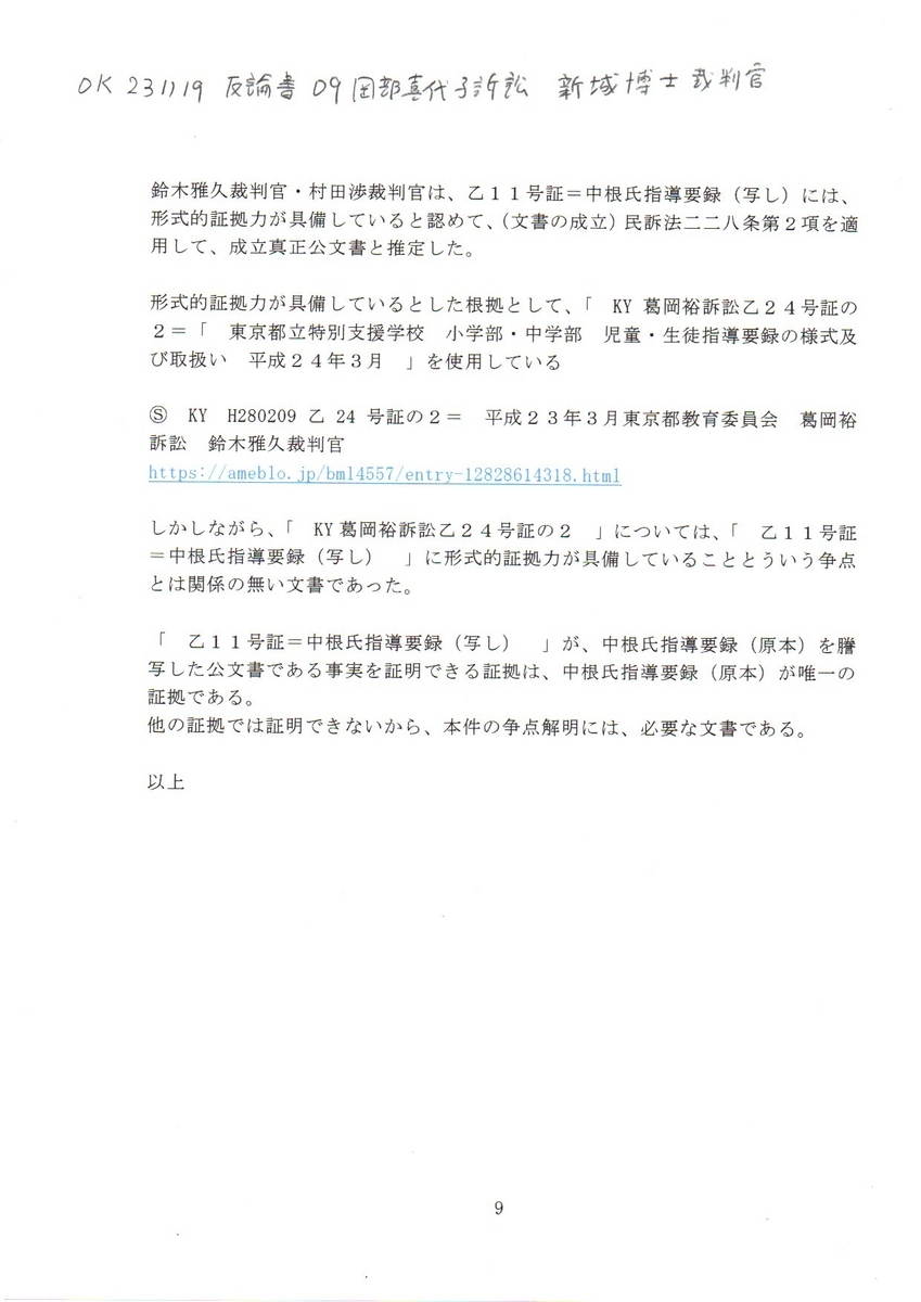 9 OK 231119 意見書に対する反論書 09岡部喜代子訴訟 新城博士裁判官