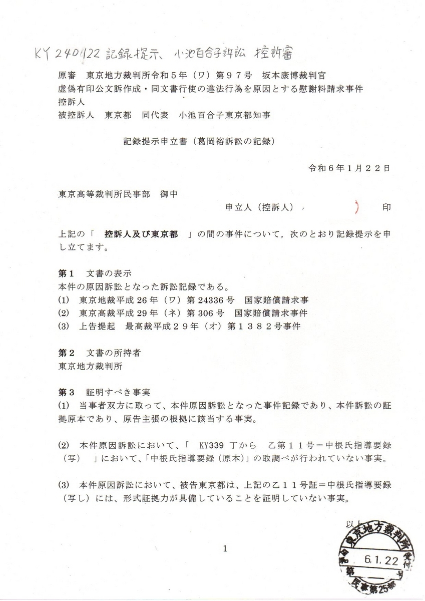 画像版 KY 240122 記録提示申立書 葛岡裕訴訟の記録 小池百合子訴訟 控訴審