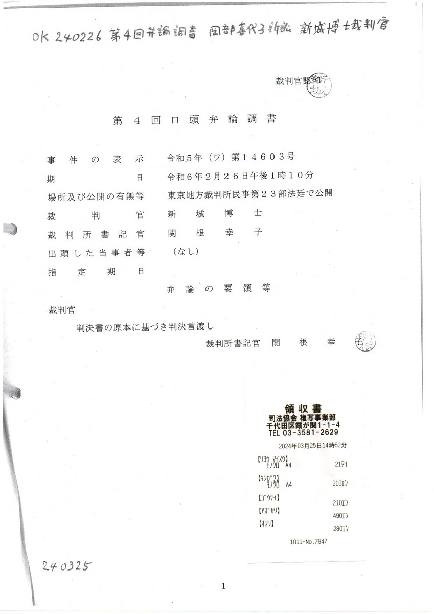 4 OK 240226 第4回弁論調書 岡部喜代子訴訟 新城博士裁判官