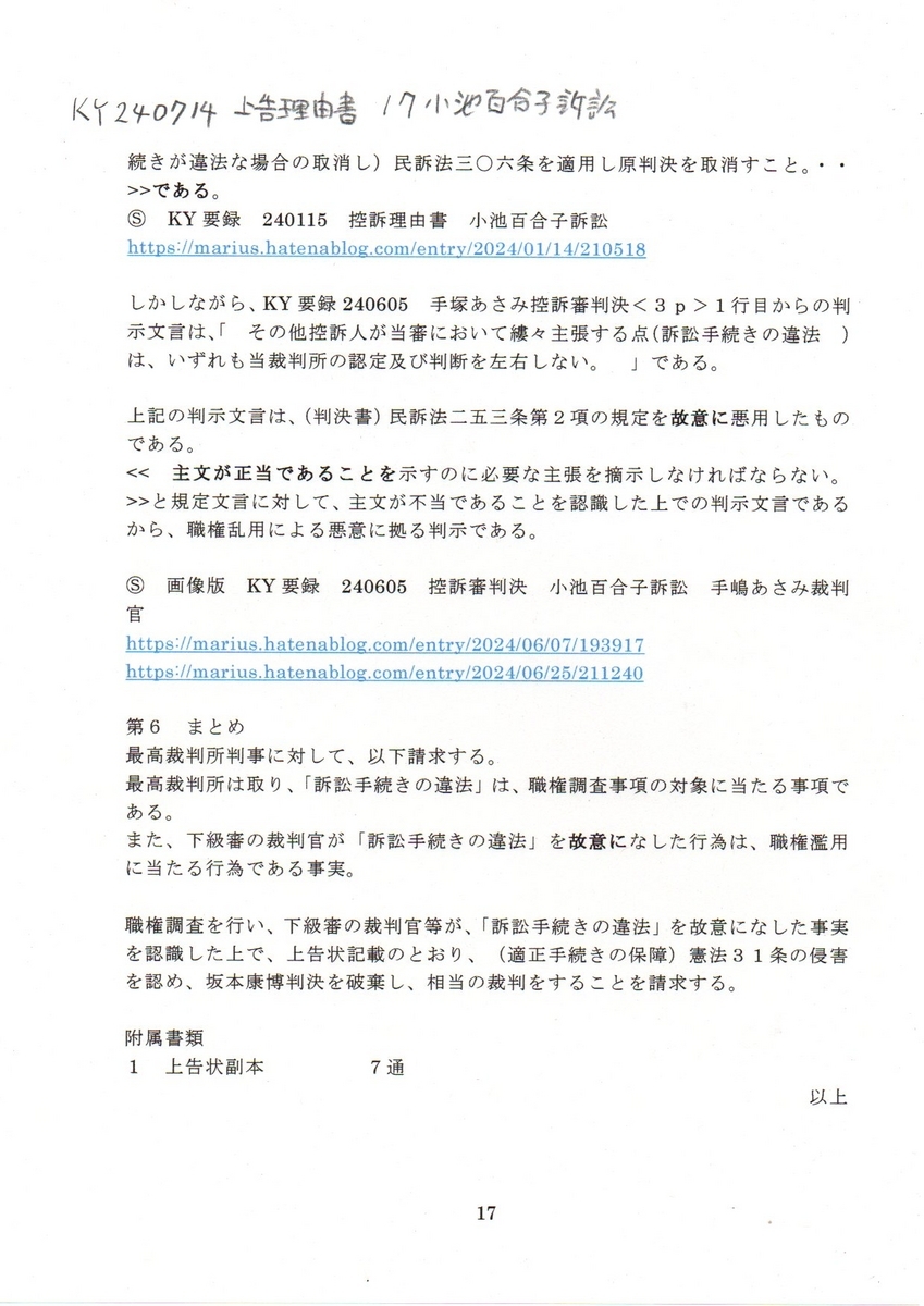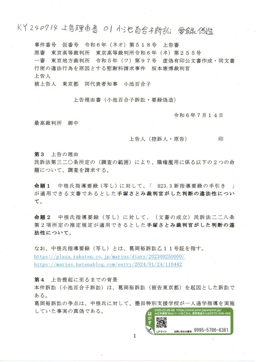 Ⓢ KY要録240617 上告状 小池百合子訴訟 慰謝料請求上告事件 要録偽造