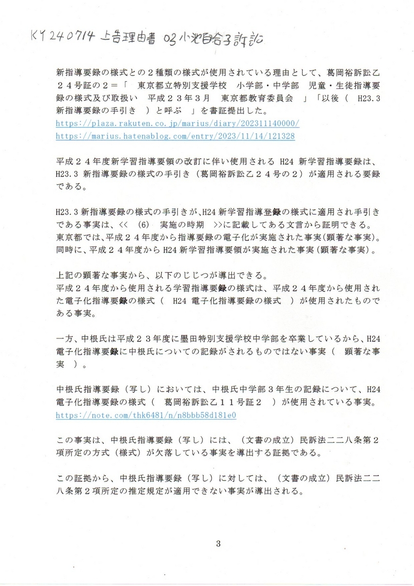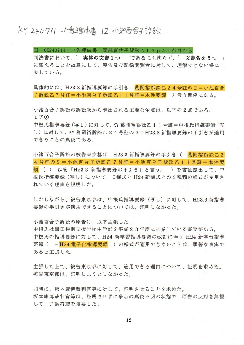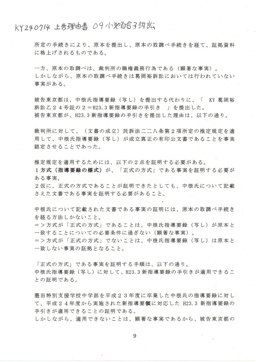 テキスト版 KY要録 240714 上告状理由書 小池百合子訴訟 要録偽造