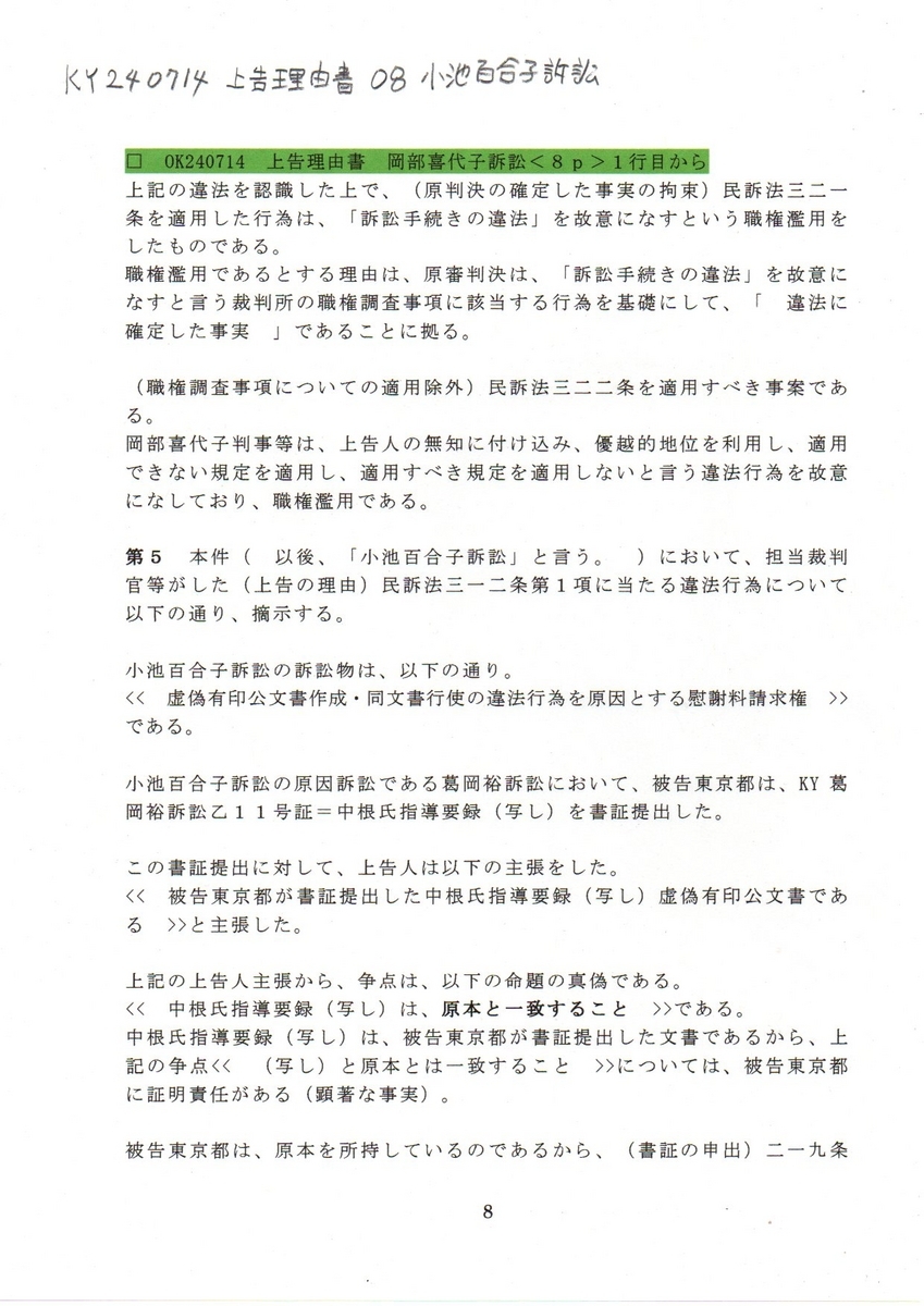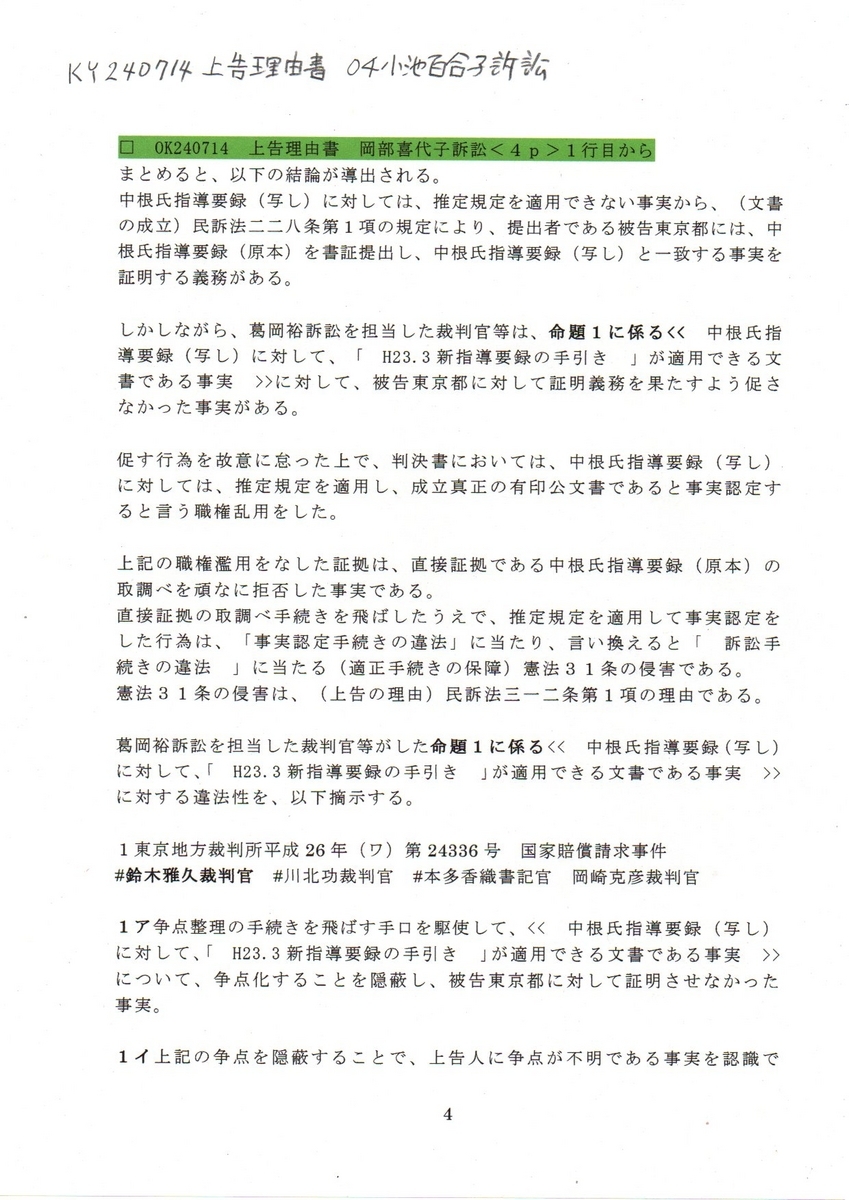 訂正 <<□ 240714 上告理由書 岡部喜代子訴訟>>と表示されているが、<<小池百合子訴訟>>と訂正する。