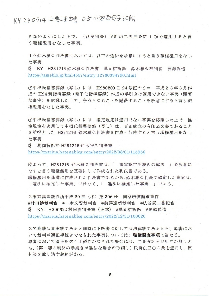 05KY要録 240714上告状理由書 05小池百合子訴訟