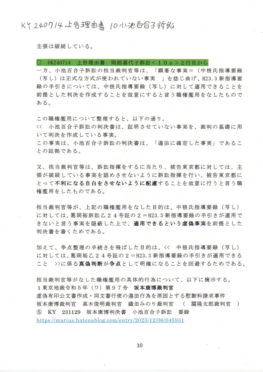 10KY要録 240714上告状理由書 10小池百合子訴訟