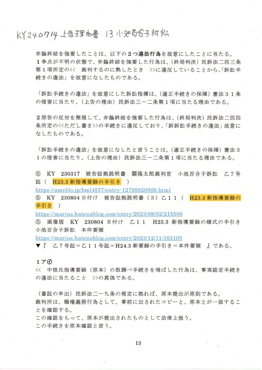 13KY要録 240714上告状理由書 13小池百合子訴訟