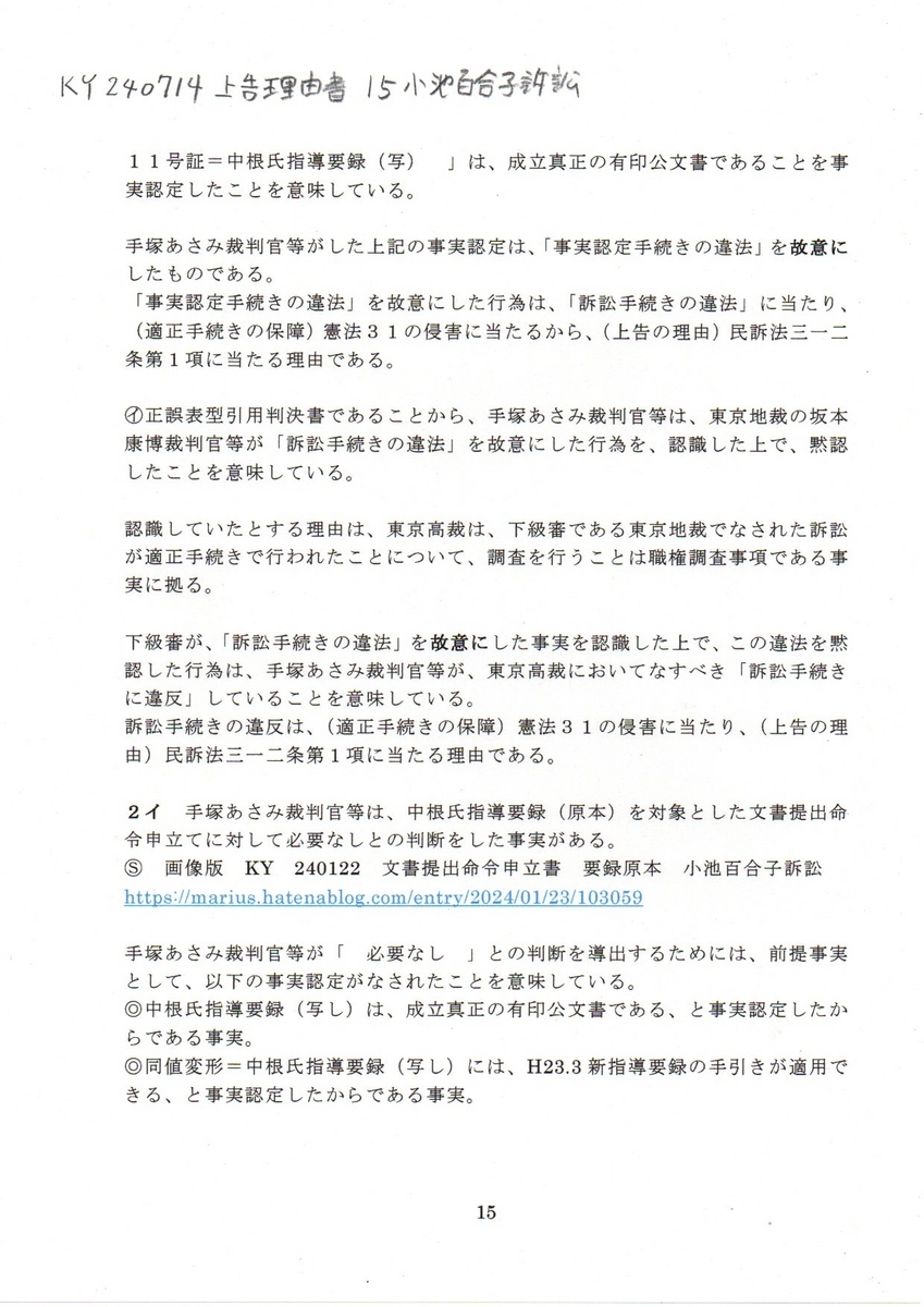 15KY要録 240714上告状理由書 15小池百合子訴訟