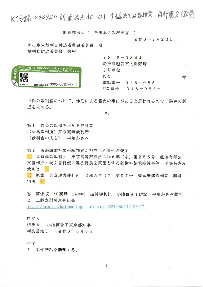 1KY要録 240720訴追請求状 01手塚あさみ裁判官
