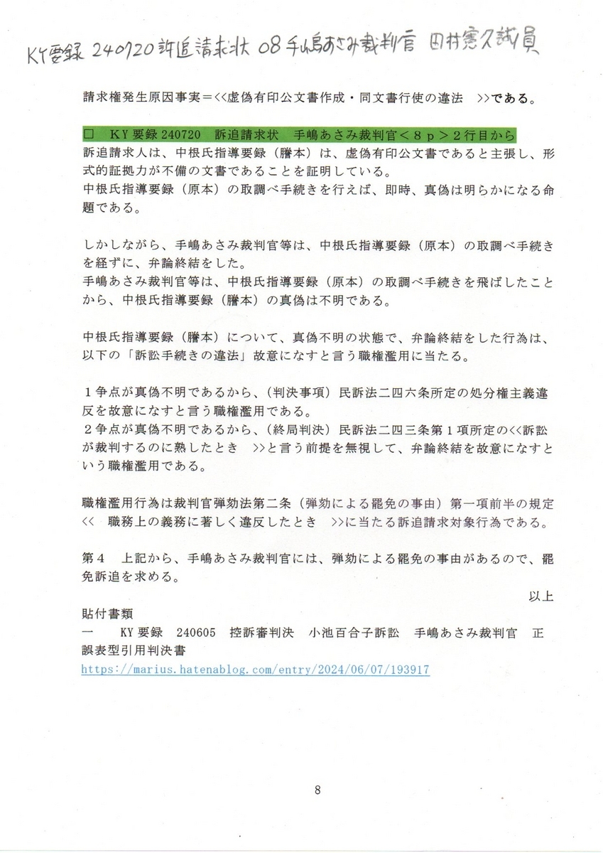 8KY要録 240720訴追請求状 08手塚あさみ裁判官