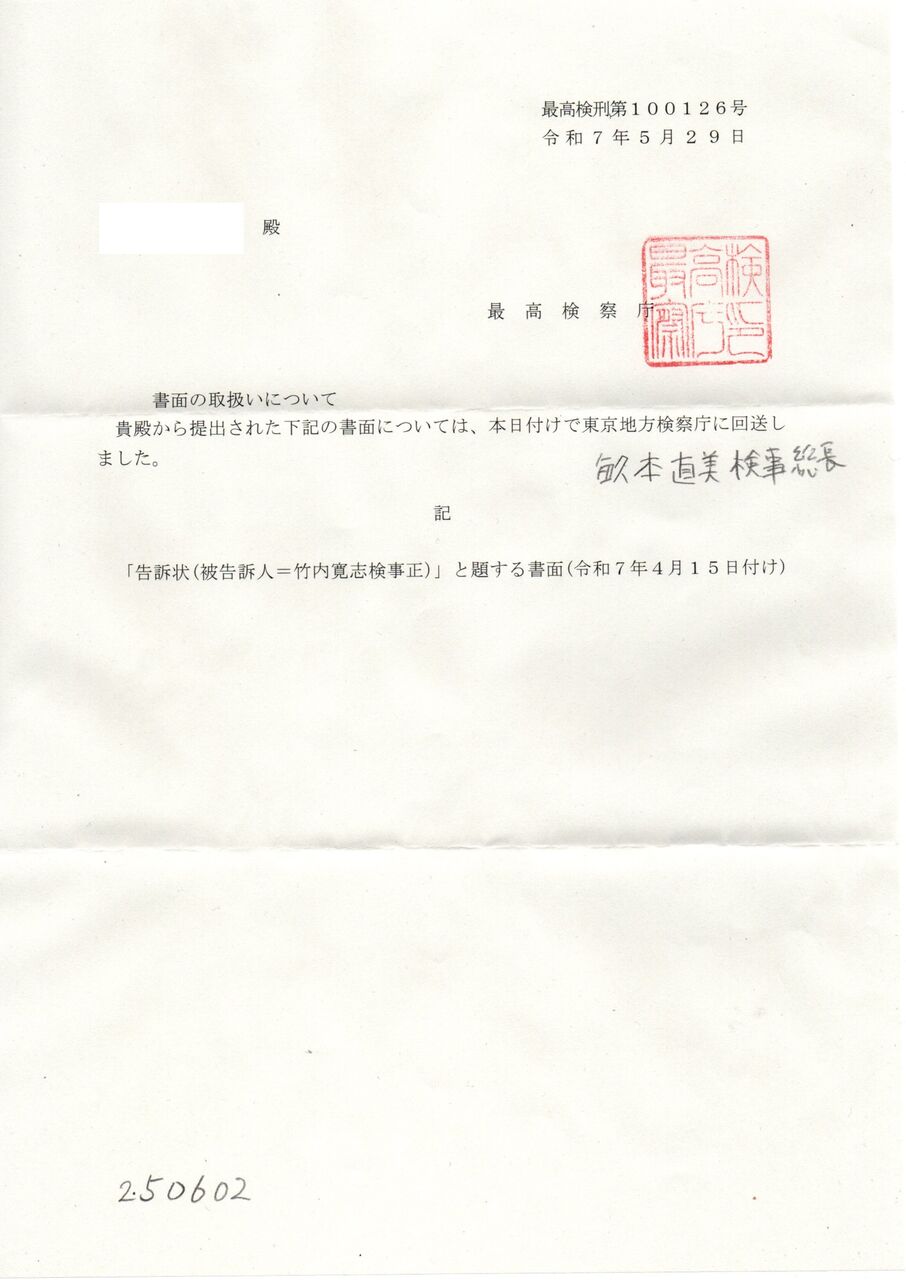 画像版 TH 250529 告訴状の回送 畝本直美検事総長から 被告訴人=竹内寛心検事正