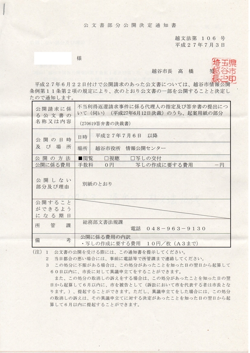1 TT H270703 部分公開決定通知 01高橋務越谷市長