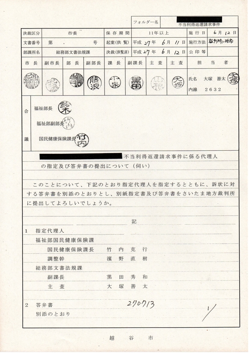開示請求文言=<< 不当利得返還請求事件に係る代理人の指定及び答弁書の提出について(伺い) (平成27年6月12日決済)のうち、起案用紙の部分