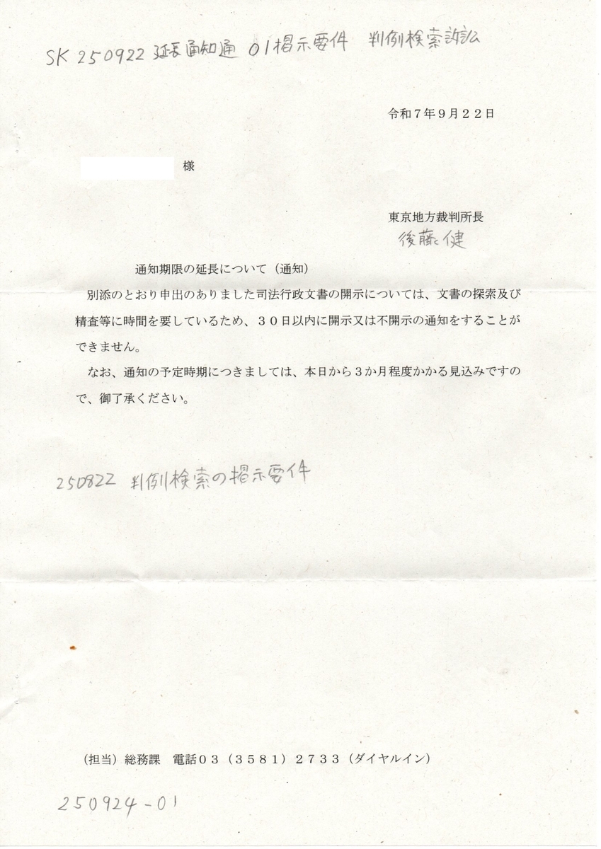 画像版 SK 250922 延長通知 掲示要件 判例検索訴訟 後藤健東京地法裁判所所長から