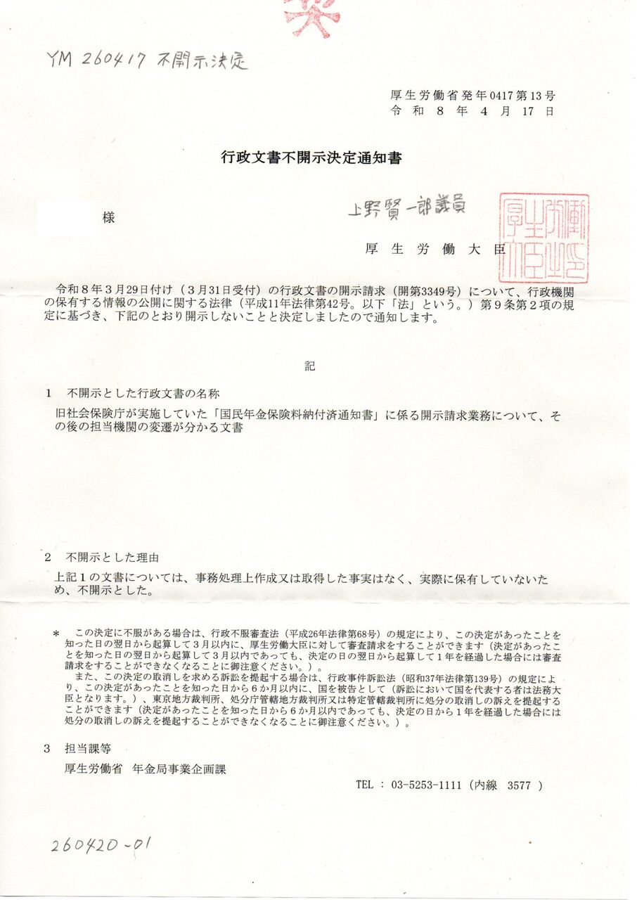 画像版 YM 260417 不開示決定 厚生労働省 上野賢一郎議員