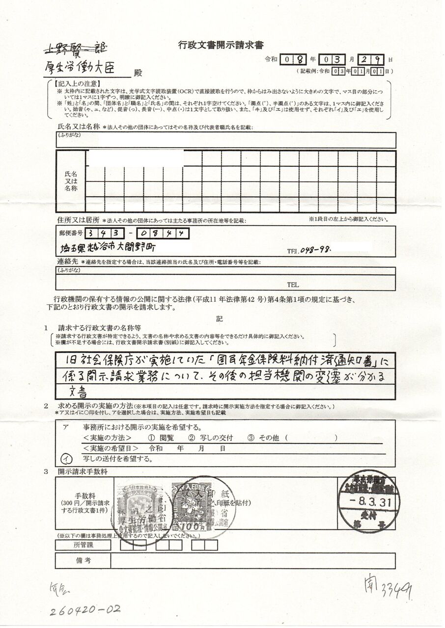 旧社会保険庁が実施していた「国民年金保険料納付済通知書」に係る開示請求業務について、その後の担当機関の変遷が分かる文書